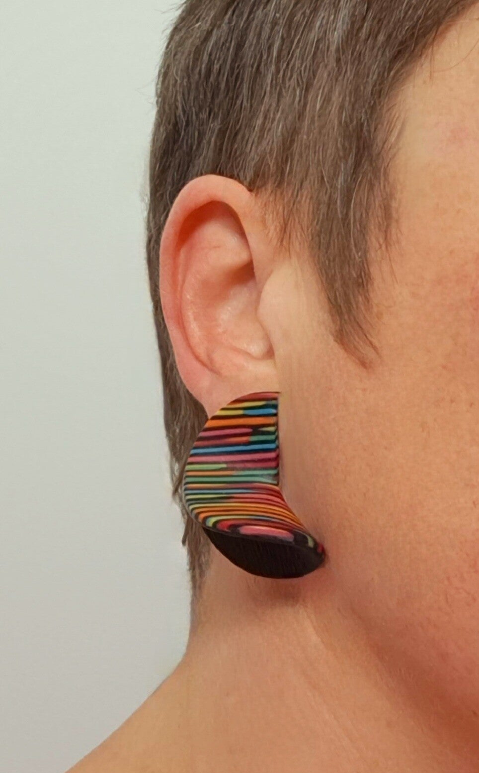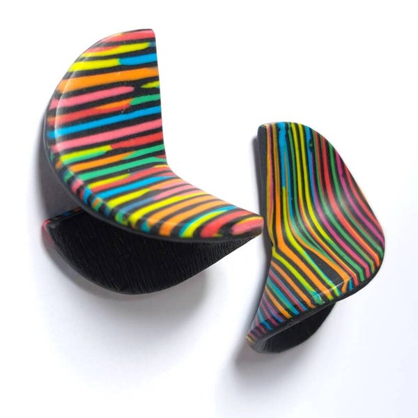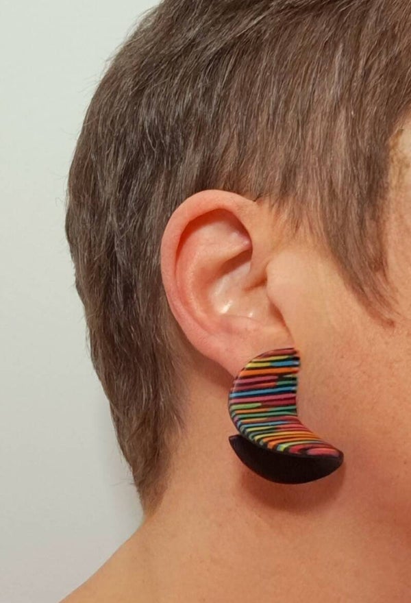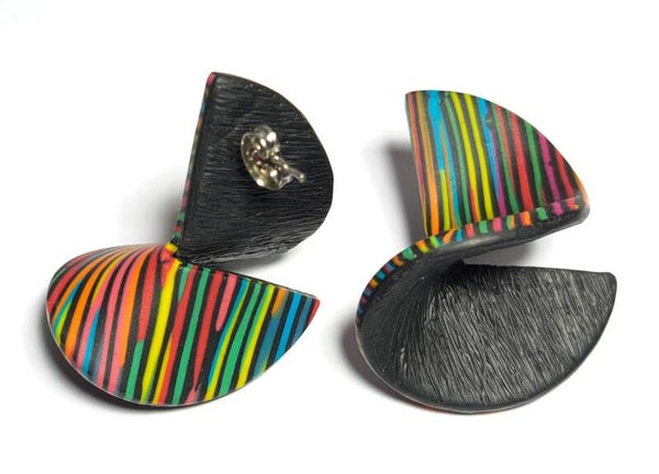 De 'binnenkant'/'achterkant' van de oorbellen zijn zwart en bewerkte ik met een techniek waardoor ze een streepjes reliëf kregen.