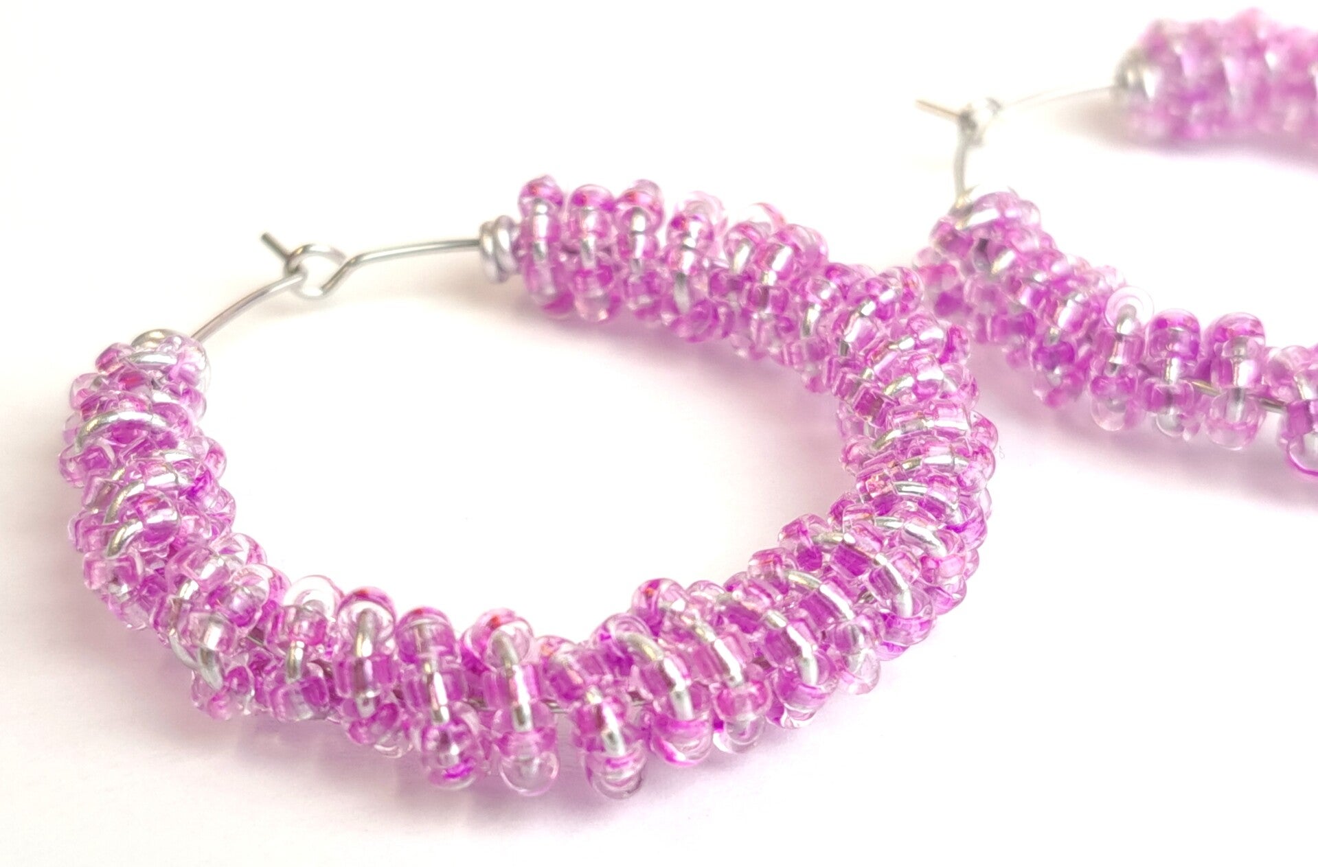 De creool oorbellen hebben een zilverkleurige basis waar de semi transparante lila kraaltjes omheen gedraaid zijn.