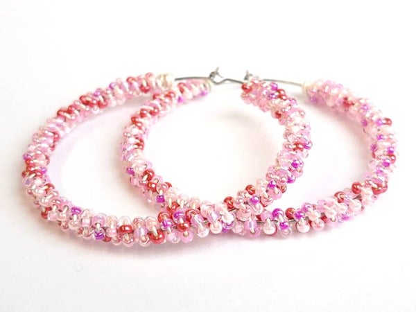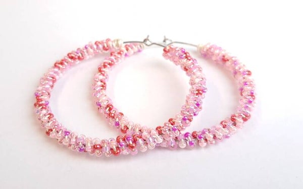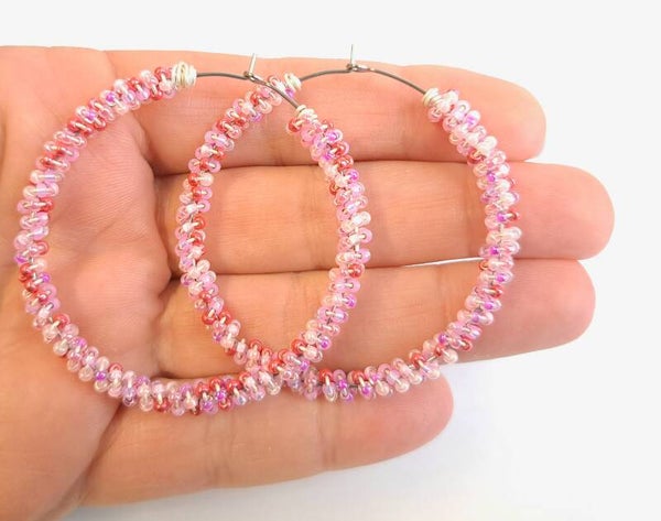 De basis is een zilverkleurige creool oorbel, met prachtige parelmoer shiny kraaltjes in roze/rood/lila.