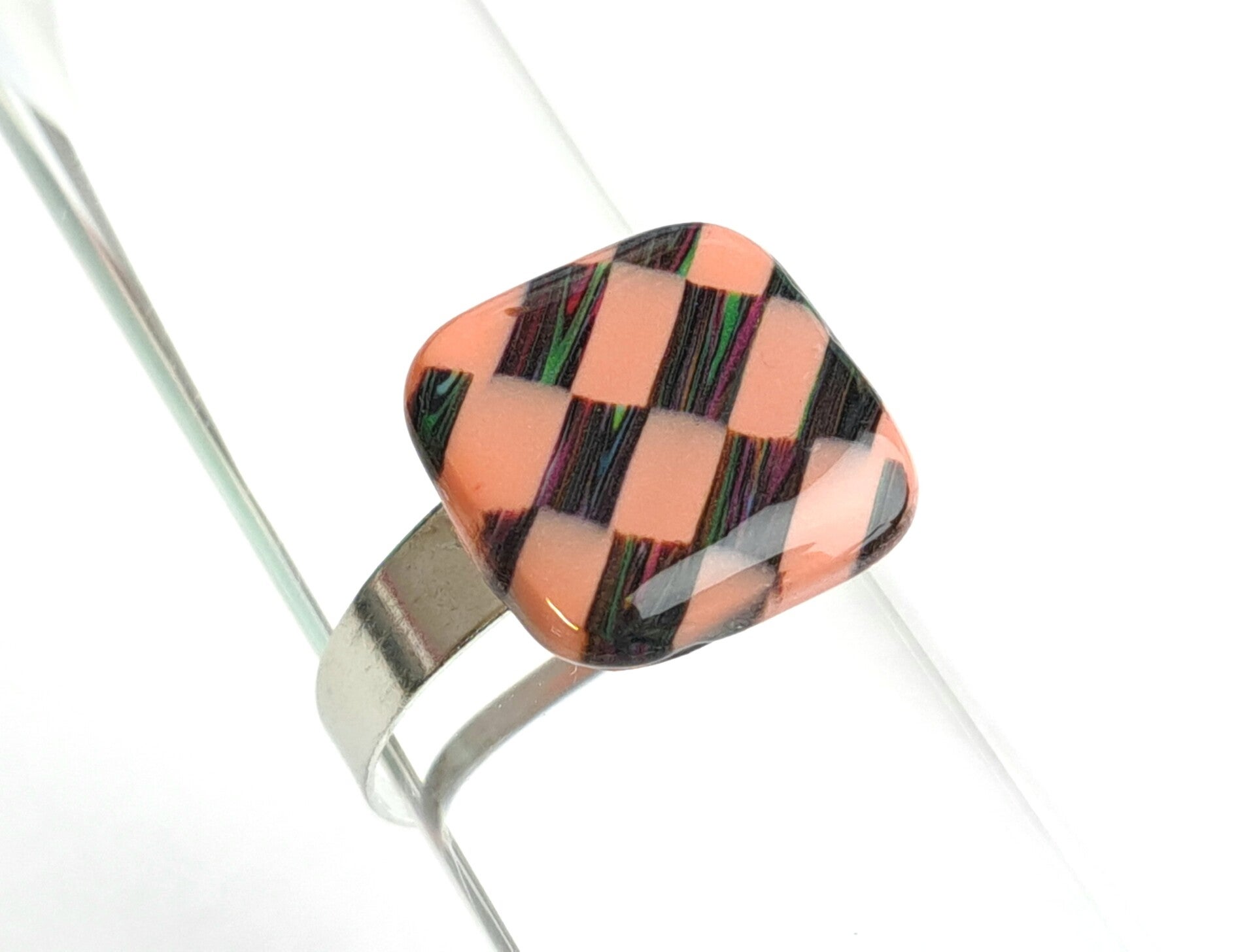 De basis is zacht perzik kleur, de blokjes zijn zwart met roze, groen, rood en blauwe fijne streepjes erin.