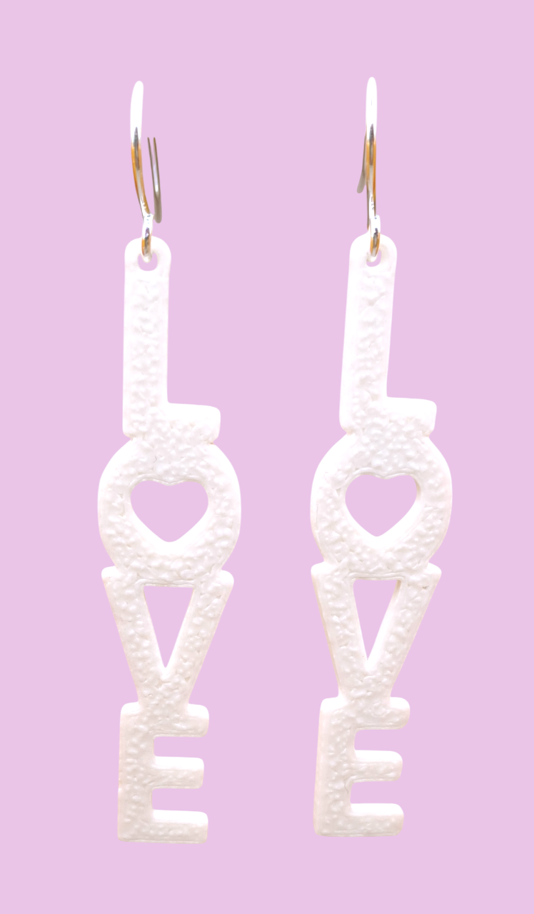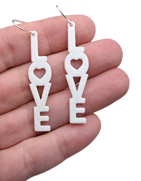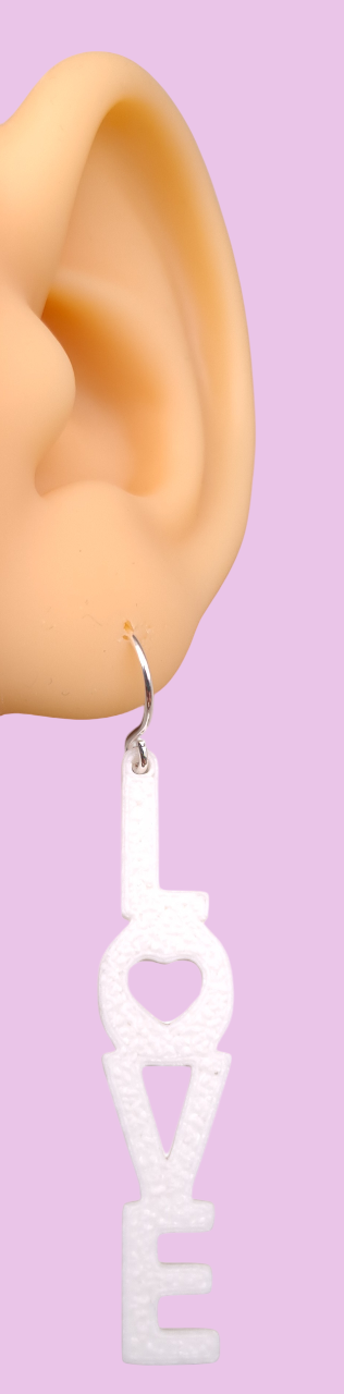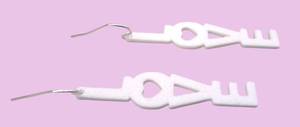 Deze super leuke originele 'love' oorbellen zijn gemaakt met een 3D printer van biologisch afbreekbaar filament van melkzuur.