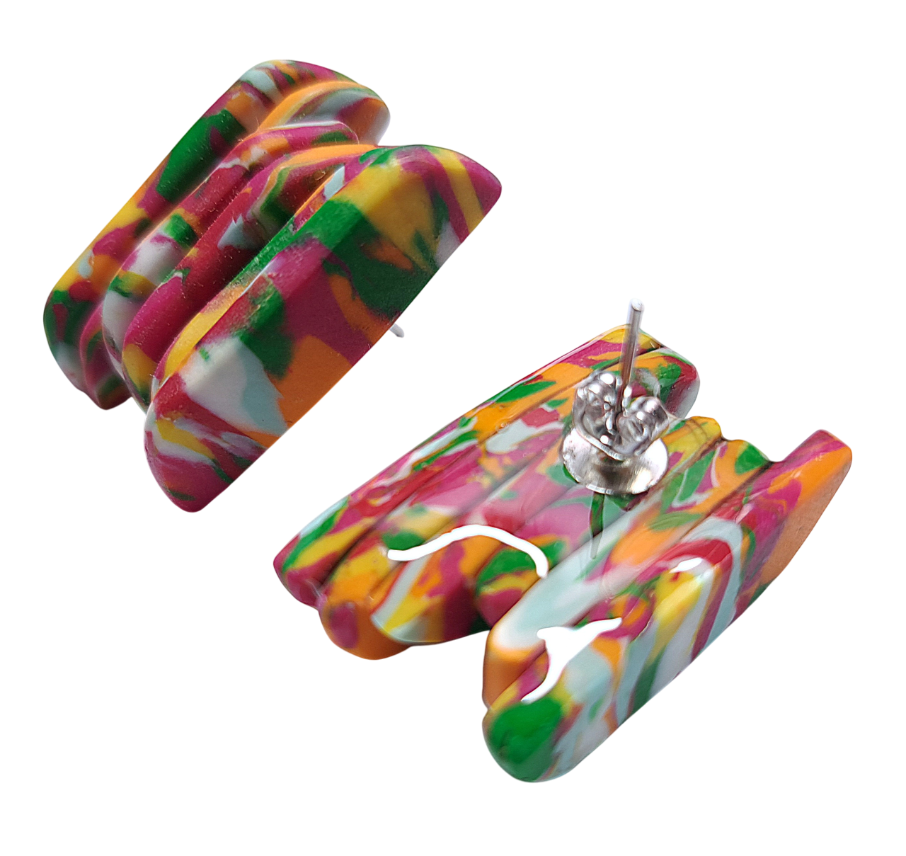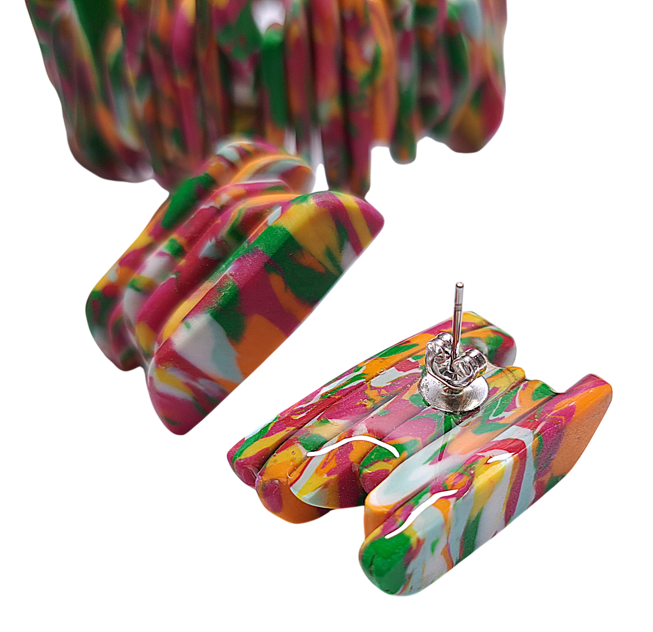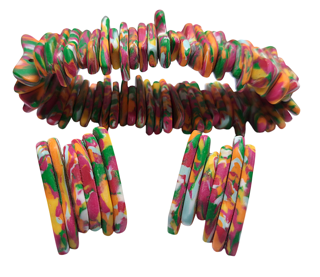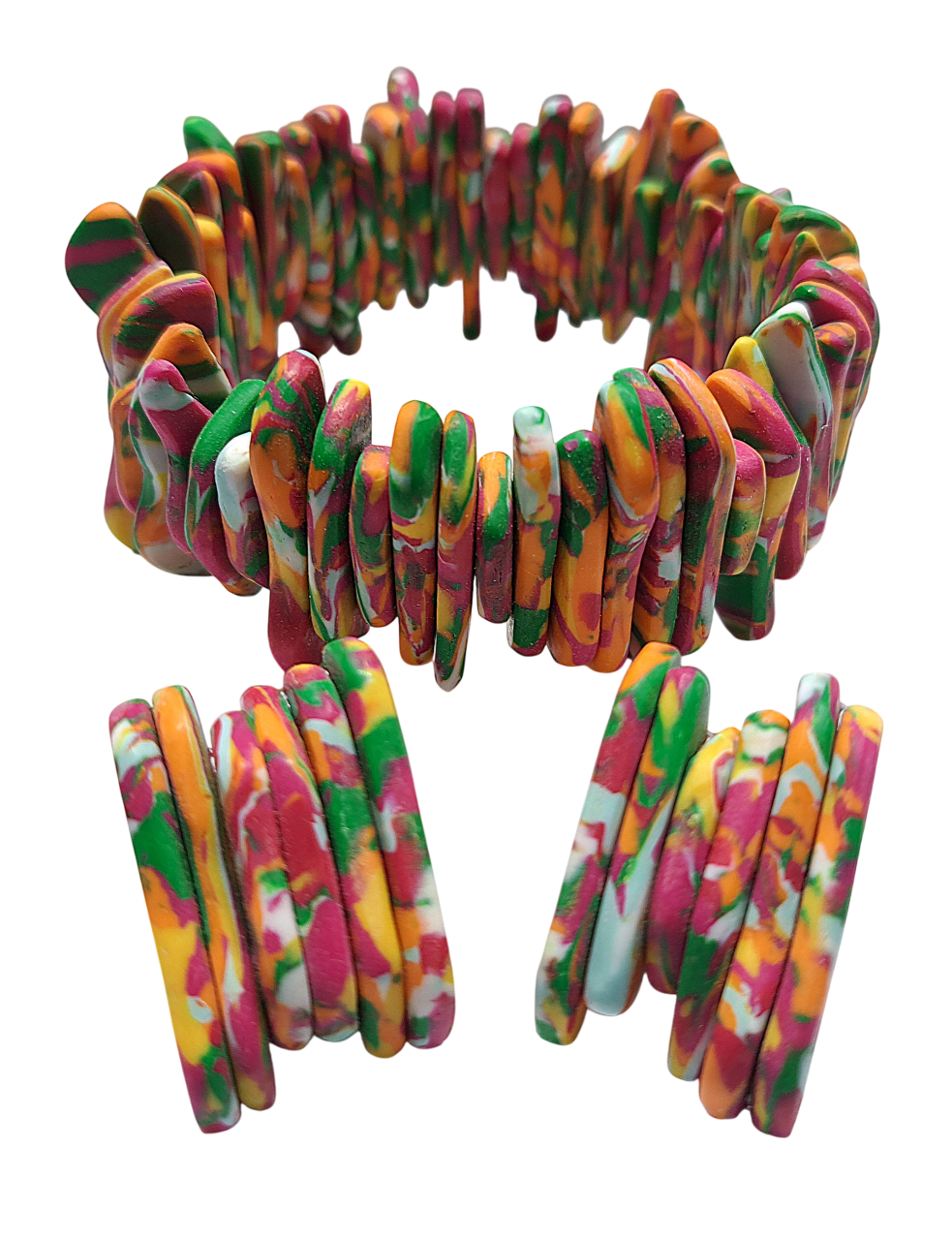 Een chunky armband en oorbellen in levendig fuchsia met groen, geel, wit, oranje.