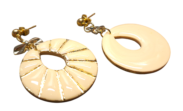 Cirkels met goudkleurige strepen. De vanille kleurige stukken zijn bewerkt met resin, de goudkleurige strepen niet waardoor er een soort van licht 'kussen' effect ontstaat.