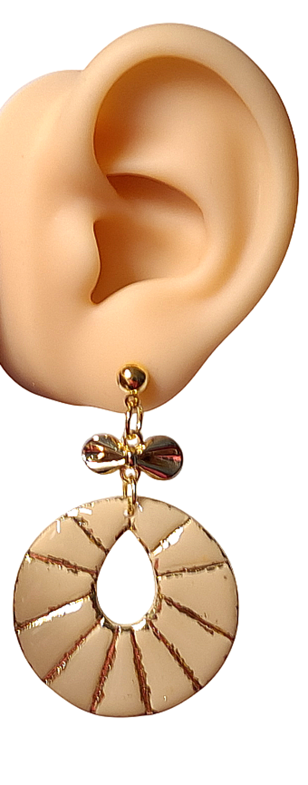 De oorbellen hebben een goudkleurig strikje en een goudkleurig stekertje met bolletje erop.